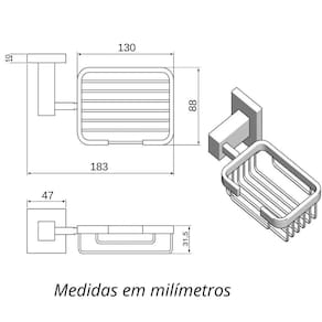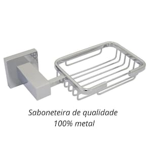Medidas: Saboneteira metal quadrada: altura 3 cm x comprimento 18cm x largura 8,8 cm.