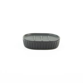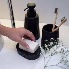 Essa é a saboneteira de resina listras preto da OIKOS.Prática: seu banheiro muito mais bonito e funcional. esta peça coringa serve como apoio para sabonetes, evitando que o produto fique em contato direto com a água e garantindo uma maior durabilidade. seus sabonetes preferidos mais acolhidos e realçados, aquele cheirinho bom sempre ao alcance das mãos.Multifuncional: boa para acomodar sabonetes de rosto e corpo, xampu e até condicionador sólido.Onde se usa? no lavabo fica ótimo e no banheiro também. e quer uma dica? quando é apoiada em cima de uma bandeja na bancada da pia, do lado do porta sabonete, ele fica um charme só! Superfície assimétrica: é decorativa e traz para seus cômodos todo o charme da tendência industrial e contemporânea. um item indispensável que também consegue transformar seus ambientes, além de encantar as visitas :)Feita de resina: a poliresina é um material estável e resistente, não deforma e é bem difícil de quebrar. ainda é impermeável e um clássico na decoração. o tom preto fosco e as bordas arredondadas também deixam a casa mais moderna e suave. Além da peça avulsa, você encontra outros itens dessa família para deixar sua decoração completa: temos o porta objetos, o porta sabonete líquido e escova sanitária com suporte. todos os produtos estão disponíveis na cor preta e verde.Cuidados: lave com água e sabão neutro em seguida passe suavemente um pano seco. não utilize produtos químicos ou abrasivos na limpeza.
