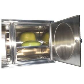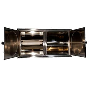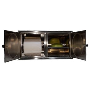 A saboneteira conjugada com papeleira de embutir de aço inox, aço 304 é forjada com o mais nobre metal, não enferruja, não oxida e tem uma grande resistência a intemperes. Com portas duplas independentes protege o papel higiênico de umidade direta e poeira, conservando o papel mais higiênico.