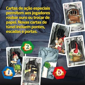 -novos papéis: Chefe, Profiteiro, Geólogos e novos Sabotadores -equipes de Mineradores: Verde e Azul disputam quem chega ao ouro primeiro -cartas de ação inéditas: Roubar ouro, Troca de papéis, Inspeção e Prisão -túnel com portas coloridas, escadas e cristais - mais desafios e possibilidades -para 2 a 12 jogadores - perfeito para grupos grandes