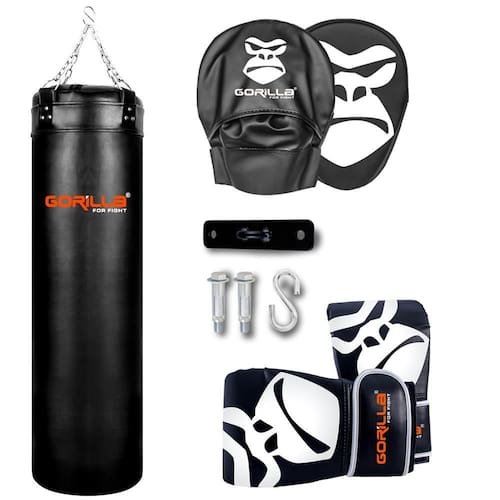 Saco 120 Cm + Luva PRO + Manopla + Suporte Teto Kit Completo Cor: preto O kit acompanha: 01 Saco de Pancadas 120x100 Gorilla 01 Luva Bate Saco Pro Par Gorilla 01 Suporte De Teto Retangular 01 Manopla de Foco Par Gorilla. Saco De Pancada Gorilla 120x100 - Gorilla. ideal para treinos de atletas profissionais e amadores, indicado para aplicação de chutes e socos altos cabeça médios peitoral . Confeccionado em policloreto de alta resistência, o saco de boxe possuí 120 cm de altura por 100 cm de circunferência O tamanho total contando desde o fundo do produto até o término da alça fica em aproximadamente 135 cm de altura . Quatro pontas de apoio reforçadas com dupla camada de PU acompanhadas com argolas, correntes e um exclusivo gancho em S, pronto para pendurá-lo O saco de pancada é enviado VAZIO e possuí um zíper na parte superior facilitando o enchimento. Especificações: Medidas: 120 cm de altura x 100 cm de circunferência; Produto enviado VAZIO; Peso suportado: até 70 kg; Materiais indicados para o enchimento: Retalhos: Em confecções geralmente fornecem de graça ou são vendidas por quilo por um preço bem acessível . Estopas: Autopeças e lojas especializadas são vendidas por quilo por um preço bem acessível . Raspas de borracha: Empresas de recapeamento de pneus. Serragem: Encontrada em marcenarias e empresas que produzem esquadrias de madeira também fornecem de graça ou são vendidas por quilo por um preço bem acessível . Luva Bate-Saco PRO - Gorilla Desenvolvida para conforto e proteção necessária ao atleta. A Luva Bate-Saco PRO Gorilla é fabricada em PU flexível com proteção acrílica-vinílica aumentando as propriedades de resistência e facilitando a higienização do produto. Ela é revestida com duas camadas de diferentes densidades dando maior conforto para o atleta. Possuí o fecho no punho em tiras aderentes facilitando a colocação e proporcionando um melhor ajuste a diferentes tamanhos de pulsos. Abertura no dedão; Indicações: Ideal para treinos em sacos de pancadas, manoplas e aparadores. Acompanham o produto: 01 luva bate-saco par Suporte De Teto Retangular Para Saco De Pancada - Gorilla Suporta sacos de pancada de todos os tamanhos, até 150 kg. Ele acompanha dois parabotls. Diferente dos parafusos comuns os parabolts possuem maior fixação pois eles funcionam como chumbadores dando toda segurança que o atleta necessita. Fabricado com aço de alta qualidade o suporte para saco de pancada é zincado não enferruja , sua pintura é feita com a tecnologia eletrostática. Possui 2 pontos de fixação para prender firmemente o suporte ao teto; Indicações: Para sacos de pancadas até 240 kg; Acompanham o produto: 01 Mosquetão com trava 02 Parabolts tamanho: Adulto Manopla De Foco - Boxe - Muay-thai - Gorilla A Manopla De Foco tem seu formato anatômico proporcionando maior precisão no deferimento dos socos. Ele é fabricado em PU projetado para receber muita porrada sem desgastar. Preenchido com duas camadas de diferentes densidades proporcionando proteção ao atleta. Sua costura foi aprimorada com uma linha especial para a categoria dando maior segurança em seu treino além de prolongar a vida útil do produto. Preenchimento: Espuma alta densidade; EVA; Indicações: Treino de velocidade, potência e precisão : 09 meses Fabricado por Gorilla Indústria e Comércio LTDA. Produto 100% nacional. Marca: Não Informado