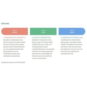 - Peso: 1,05kg - Comprimento: 205 cm - Largura do ombro: 75 cm - Tamanho do usuário: 165 - 185 cm - Medidas fechado no saco de compressão: 33 cm x 17 cm - Material: Poliamida 40D PA Ripstop / Poliéster 75D PES - Material de enchimento: Fibra High Loft Hollowfibre - Temperatura conforto: 9ºC - Temperatura limite: 6ºC - Temperatura extrema: -9C - Bolso interno para objetos de valor - Saco de compressão - Capuz com cordelete para ajuste no isolamento - Livre de PFC Marca: Não Informado