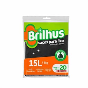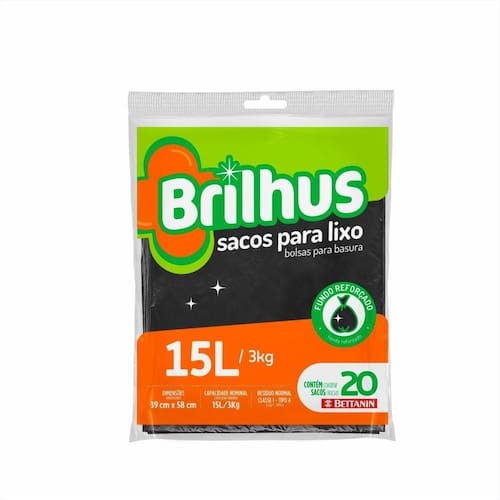 O Saco de Lixo Almofada 15L Brilhus Bettanin 20 Unidades suporta até 3 kg de resíduos e vem com 20 sacos para lixo com fundo reforçado. Na cor preta, a almofada contém unidades de 15 litros, ideais para lixeiras menores.