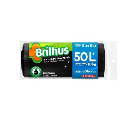 O Saco de Lixo em Rolo 50L Brilhus Bettanin 30 Unidades suporta até 10 kg de resíduos e vem com 30 sacos para lixo com fundo reforçado. Na cor preta, o rolo contém unidades de 50 litros, ideais para lixeiras grandes.