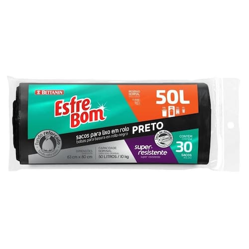 O Saco de Lixo em Rolo Reforçado Preto 50L EsfreBom Bettanin 30 Unidades é super resistente a perfurações. O fundo é reforçado, garantindo mais segurança. Com capacidade de 50L, cada rolo vem com 30 unidades.