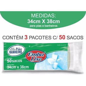 Marca embalixo Modelo pia,banheiro Saco de lixo em rolo Uso exclusivo para acondicionamento de lixo de resíduo normal. Este produto não é adequado para acondicionar lixo perfurante. Litros: 15 litros Contém: 150 sacos Largura: 34 cm x altura: 38 cm Produto reciclado e reciclável Validade: indeterminada