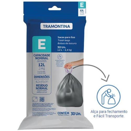 Postagem em até 24hr para agilizar seu recebimento Tenha total tranquilidade em comprar de uma empresa com experiência de 15 anos na distribuição de artigos para construção, reforma e decoração, nossa equipe de pós venda está sempre disposta para ajudar conte conoscoA casa online tem como missão servir com excelênciaSeu cantinho é único e merece o melhor Saco plástico de lixo 12l c para lixeiras tramontina ref:94531012Se você é daqueles que preza por um ambiente limpo, organizado e livre de odores desagradáveis, o saco plástico de lixo 12l para lixeiras tramontina é indispensável.Desenvolvido especialmente para as lixeiras tramontina, ele é a solução perfeita para manter o seu ambiente livre de resíduos e com uma aparência impecável. Sua produção é feita com materiais de alta qualidade, garantindo a sua resistência contra rasgos.O saco plástico de lixo tramontina possui alças especiais que permitem um fácil transporte e descarte do lixo, proporcionando maior praticidade e comodidade para o seu dia a dia. Além de todas essas características, ele é versátil e pode ser utilizado em diversos ambientes, como banheiros, cozinhas e escritórios.100% reciclável, é um produto que contribui para a sustentabilidade do planeta e do meio ambienteMaterial: plástico 100% reciclável e de alta resistência, conforme norma abnt nbr 9191: 2008.Capacidade: 12 litros / 2,4kg. Letra e .Embalagem com 30 unidades.Possui alça para fechamento e transporte.Sistema exclusivo para lixeiras tramontina. Embalagem com letra indicativa de tamanho de saco lixo, consulte o folheto na página do produto e veja quais lixeiras são compatíveis.Todas as imagens são meramente ilustrativas.Recomendações de uso:Para evitar o perigo de asfixia, manter a embalagem e o saco de lixo fora do alcance de crianças.Os sacos não são recomendados para conteúdos perfurantes.Uso exclusivo para lixo.Garantia:90 dias de garantia legal.Aguardamos seu pedido, enviaremos com todo carinho