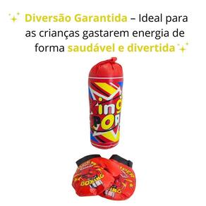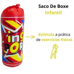 Saco de pancadas boxe infantil com luvas esporte wb7955 Estampa: king Tamanho: un Transforme a brincadeira em diversão saudável este kit de boxe é perfeito para crianças gastarem energia, desenvolverem coordenação motora e se exercitarem de forma divertida. Conta com 1 saco de boxe e 1 par de luvas, ideal para crianças acima de 03 anos, seu material leve, seguro e resiste, pode ser pendurado em qualquer local de fácil acesso para as crianças, além de ser uma excelente opção de presente para as crianças, o seu designer colorido chama atenção e torna a brincadeira ainda mais agradável. Garanta já o seu e proporcione momentos de lazer e atividade física para os pequenos Por que comprar com a imports - enviamos em até 24 horas; - produto de ótima qualidade; - produto testado e muito bem embalado para chegar em perfeito estado; - foco total no cliente. Informações importantes: - modelo: saco de boxe infantil com luvas - material: plástico pvc + further - medidas: Saco - 35x12 cm Luvas - 19x17x9 cm - material leve e resistente - fácil de pendurar - estimula a prática de exercícios físicos - recomendado para crianças acima de 03 anos - registro inmetro: 003292/2024 Marca: Não Informado
