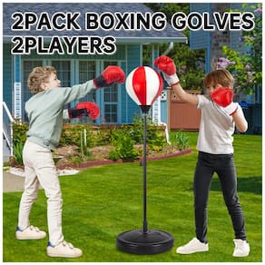 Saco de pancadas infantil ShyLizard com suporte ajustável, desenvolvido para crianças de aproximadamente 5 a 10 anos, acompanhado de 2 pares de luvas e bomba de ar para uso doméstico. O conjunto inclui bola de boxe inflável em suporte vertical, base para enchimento com água ou areia e mola resistente que permite movimentação da bola em múltiplas direções durante os golpes.?
