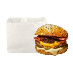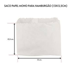 Saquinho em papel mono para hambúrguer. O papel mono é o papel branquinho. Este tipo de saquinho é muito prático, extremamente barato, uma opção simples, prática para os hambúrgueres.