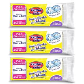 Saco para lixo pia e banheiro neutraliza odores c/300 Saco para lixo pia e banheiro neutraliza odores c/300 Saco de lixo para pia e banheiro - 38cm x 40cm Os sacos de lixo para pia e banheiro da embalixo são produzidos com excelente relação custo-benefício para os mais diversos usos e ambientes. Possui a tecnologia neutralizador de odores que inibe os odores indesejáveis, além do perfume lavanda, que deixa o ambiente mais agradável. Única no país a ter autorização de utilização de fragrâncias da iff international flavors & fragances para produção de sacos para lixo. Não contém fechos Validade indeterminada Mantenha fora do alcance de crianças Saco não adequado a conteúdos perfurantes Dimensões: 38cm x 40cm Quantidade: 3 pacotes, contendo 100 unidades. Marca: Não Informado