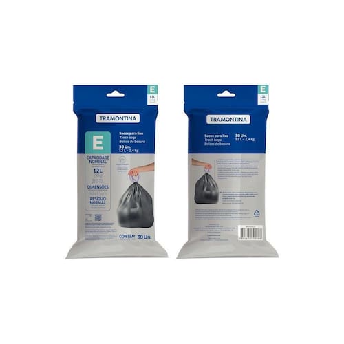 Mais Informações - Material: plástico 100% reciclável e de alta resistência, conforme norma ABNT NBR 9191: 2008.Capacidade: 12 litros / 2,4kg. Letra (E).Embalagem com 30 unidades.Possui alça para fechamento e transporte.Sistema exclusivo para lixeiras Tramontina. Embalagem com letra indicativa de tamanho de saco lixo, consulte o folheto na página do produto e veja quais lixeiras são compatíveis.Todas as imagens são meramente ilustrativas.