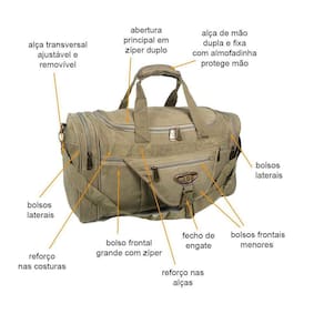 -dois bolsos laterais e mais -dois bolsos frontais todos com zíperes em metal -alça de mão e alça transversal com regulagem e removível -mosquetão em metal Medidas aproximadas externas da bolsa da kvn JA7012-21 55 cm comprimento x 30 cm altura x 27 cm largura V = 50 Litros Ean: 7893236693138