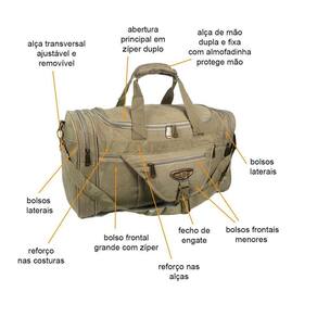 -dois bolsos laterais e mais -dois bolsos frontais todos com zíperes em metal -alça de mão e alça transversal com regulagem e removível -mosquetão em metal Medidas aproximadas externas da bolsa da kvn JA7012-21 55 cm comprimento x 30 cm altura x 27 cm largura V = 50 Litros