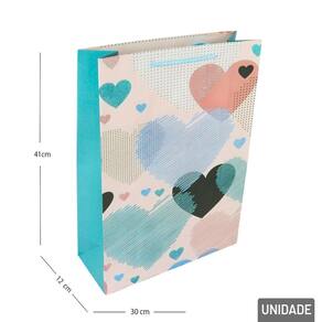 Sacola de Papel 41x30cm Corações A Sacola de Papel 41x30cm – Corações é a escolha perfeita para embalar presentes com charme e romantismo. Feita em papel resistente, possui uma estampa delicada de corações em cores , trazendo um toque especial para qualquer ocasião. Suas alças de cordão proporcionam um manuseio confortável e seguro, garantindo praticidade ao transportar presentes com estilo.\nIdeal para aniversários, Dia dos Namorados e outras celebrações, essa sacola combina beleza e funcionalidade. Seu design encantador e versátil permite embalar diferentes tipos de presentes de forma elegante, tornando o momento da entrega ainda mais especial.\nDisponível em cores e modelos . Informação Adicional Marca : TINGS Tipo de material : Papel Cores ou Estampa : Dimensões do Produto : 41 X 30 X 12 CM Dimensões da Embalagem : 41 X 30 X 12 CM Peso Bruto (Gramas) : 0.100