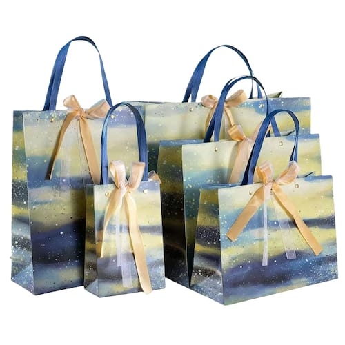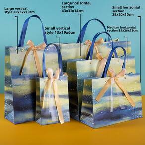 Material: Tamanhos de papelão: horizontal pequeno 28* 20* 10 cm, horizontal médio 35* 26* 13 cm, horizontal grande 43* 32* 14 cm, vertical pequeno 19* 13* 6 cm, vertical grande 32* 25* 10 cm Peso: 600 g/Quantidade do pacote: 5 unidadesMaterial de cartolina premium — Feita de papelão grosso, cada sacola de presente oferece resistência confiável e um toque estruturado, adequada para transportar roupas, acessórios, joias e itens de boutique. Pintura a óleo Starry Sky Design — apresenta uma obra de arte inspirada em galáxias com cores ricas e textura artística, criando uma aparência elegante e atraente para lojas, eventos e necessidades de embalagens elegantes. Alça de arco com reforço de rebite — Decorada com uma alça de arco combinando e rebites de metal, combinando apelo visual com maior durabilidade para um transporte confortável e seguro. Vários tamanhos para uso flexível — Inclui estilos horizontais e verticais em tamanhos variados, atendendo a diferentes necessidades de embalagem, de pequenos acessórios a roupas e itens de compras. Ideal para varejo e eventos — Adequado para lojas de roupas, lojas de acessórios, exposições, festas e eventos sazonais, adicionando um toque refinado e decorativo às embalagens do dia a dia.