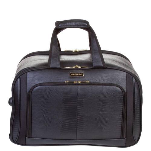 A linha Croco apresenta uma diversidade de produtos, feitos em PVC e poliéster, que trazem para as malas e sacolas o ar contemporâneo e atemporal das peças de vestuário e acessórios. A sacola com carrinho embutido é super prática e ainda vem com alça carona para levar junto com a mala. Este produto tem bolso lateral com ampla abertura e muito espaço interno, com divisórias e bolso em redinha com fecho de zíper.