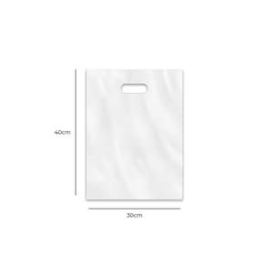 Sacola Plástica Boca de Palhaço Reta Branca 30x40 100un. Sacola Plástica Alça Vazada Branca Reta 30x40 Altura - 30 cm Largura - 40 cm