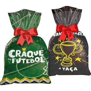 Conjunto com 12 sacolas plásticas temáticas, com design vibrante inspirado no universo do futebol.