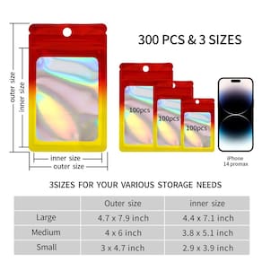 -?O pacote inclui?Você receberá 100 unidades de bolsas com zíper para janelas com 3 tamanhos diferentes, 300 unidades no total. Os três tamanhos são 3 x 4,7 polegadas, 4 x 6 polegadas e 4,7 x 7,9 polegadas, correspondendo à maioria das necessidades diárias de nossas vidas.