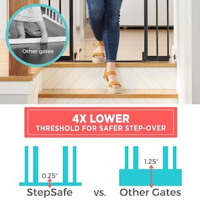 ULTRA BAIXO: limite extremamente baixo — apenas 0,25” de altura — a barra inferior é 4 vezes mais baixa do que outros portões de segurança, reduzindo o risco de tropeçar