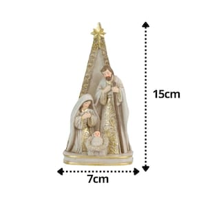 Celebre o verdadeiro significado do Natal com a delicadeza e a beleza da Sagrada Família em Poliresina. Este conjunto encantador, com 15cm de altura, retrata Maria, José e o Menino Jesus em detalhes finos e elegantes. Com acabamento em branco e dourado, esta peça se destaca por sua simplicidade e sofisticação, tornando-se o centro perfeito para a decoração natalina em sua casa.