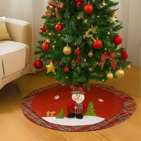 Finalize sua decoração natalina com elegância utilizando a saia para árvore de Natal modelo prime, confeccionada em tecido linho vinho com aplique de Boneco de neve em pelúcia e borda xadrez festiva, trazendo aconchego e sofisticação ao ambiente.