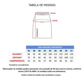 A saia é confeccionada em tecido MILANO PLUS, da DOPTEX, a composição do tecido é de 74% Poliéster, 22% Viscose e 4% Elastano.