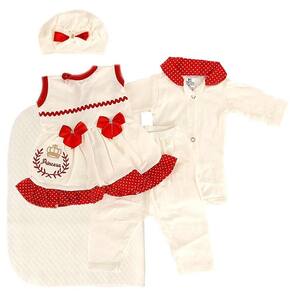 Conjunto de Roupa de Luxo Bege e Vermelho com 5 peças, é uma excelente escolha para o seu bebê, com um acabamento de ótima qualidade e super lindo, ideal para a sua princesinha Nosso enxoval é totalmente diferente do que você já viu, contendo uma touquinha de bichinho, um coletinho com touca, um body com bordado de girafinha e uma calça, para deixar sua filha confortável e super linda