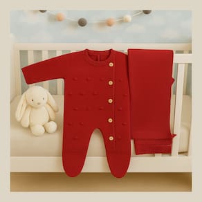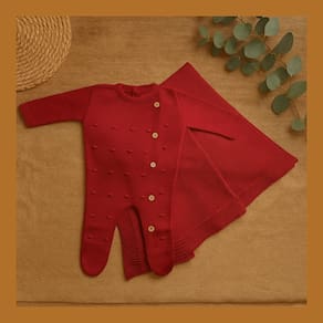 O conjunto traz o toque aconchegante do tricot para vestir seu amor com muito estilo. A manta e o macacão são peças versáteis, Perfeito para presentear!