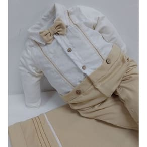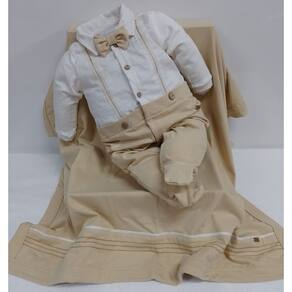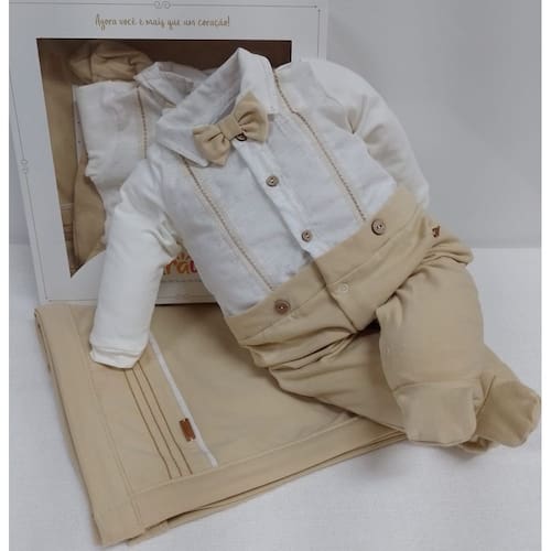 Características do Produto: - Macacão manga longa em malha ultra confort, super macio e confortável. A gola e a parte superior frontal em linnho. Detalhe de bordado imitando alças que dão um charme todo especial a peça. Recorte na cintura, botões aplicados, e bolsos fake. Abertura frontal por botões personalizados na parte superior. Botões de pressão na parte inferior e entre pernas. Um luxo! - Manta também em malha confort. Detalhes de bordado e etiqueta da marca, combinando ao macacão. Medidas aproximadas da manta: 70cm x 80cm. - Gravatinha borboleta fixada por botão com elástico. Pode ser removida. Este conjunto é ideal para deixar seu bebê arrumadinho e estiloso desde os primeiros momentos.
