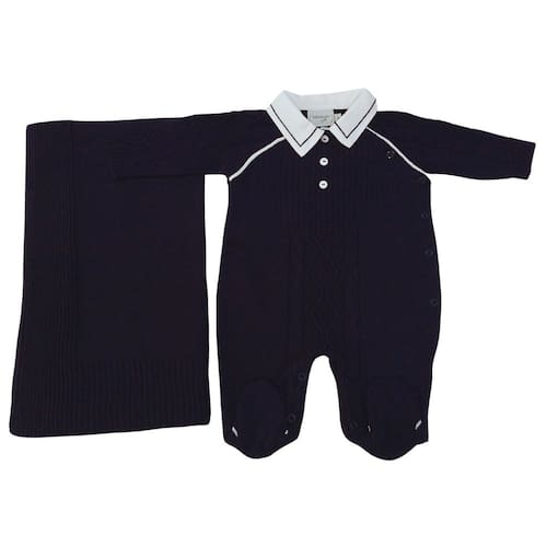 Kit Saida de maternidade maravilhoso, 2 peças: macacão + manta no tricot 100% acrílico, gola 100% algodão, cor azul marinho com detalhes em branco, um luxo. Noruega é tudo de bom!! Perfeito para deixar seu bebê ainda mais lindo. Coleção inspirada em cores e materiais do Brasil e Europa.Tudo pensado e desenvolvido com muito carinho.