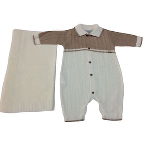 Kit Saida de maternidade maravilhoso, 2 peças: macacão + manta no tricot 100% acrílico, cor off white com areia. Um luxo. Noruega é tudo de bom!! Perfeito para deixar seu bebê ainda mais lindo. Coleção inspirada em cores e materiais do Brasil e Europa.Tudo pensado e desenvolvido com muito carinho.