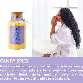 Sais de banho candy spicy 360g para banheira hidro ofurô spa relaxante hidromassagem Sais de banho candy spice - 360 ml ========= Uma fragrância inspirada em perfumes internacionais, esse aroma traz sofisticação e elegância, com um adocicado floral, deixa qualquer pele chique, envolvendo com exclusividade e personalidade. ========= Pirâmide olfativa Cabeça: pera, cassis, mandarina; coco e bergamota, grapefruit, pimenta rosa, accord whisky, pêssego e gálbano. Corpo: íris, jasmim, flor de laranjeira; notas florais, lavanda, sândalo, cardamomo, canela da índia, violeta e ylang ylang. Fundo: pralinê, baunilha, patchouly, fava tonka, caramelo, chocolate, lábdano, madeira de carvalho, cedro e sândalo. ========= Como utilizar nossos produtos em seu dia a dia os sais de banho são na banheira para relaxar, aliviar o , desintoxicar o corpo e melhorar a circulação sanguínea. Eles podem ser para deixar a pele radiante, aliviar o peso das pernas, perfumar o corpo e até desintoxicar ========= Modo de uso: Em uma banheira seca e desligada, tampe o ralo, e despeje um pouco de sais de banho no fundo da banheira. Depois ligue a torneira e deixe escorrer a água até encher a banheira, dessa forma caso não tenha hidromassagem, a própria água fará a espuma desejada . Quando a água chegar no limite da banheira, ligue a hidromassagem. Assim com o movimento da água fara mais espuma na sua banheira. Cada pote de 360ml, você utiliza para 3 banhos. Sendo aproximadamente 120ml por banho.