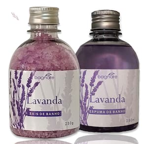 Sais De Banho e Espuma para Banheira Hidro Relaxante Lavanda Os Sais de Banho Lavanda, relaxa e suaviza a pele do corpo, tornando seu banho um momento de prazer e repondo suas energias. Quando em infusão na banheira, proporciona uma forte sensação relaxante e . proporciona uma agradável fragrância. Pode ser como escalda pés. Modo de usar: Coloque quantidade suficiente em água morna dos Sais de Banho Lavanda, deixe-se relaxar e sinta seus benefícios. Espuma de Banho Lavanda 250ml, faz uma espuma cremosa e permanece por muito tempo na banheira. Modo de usar: Coloque quantidade suficiente em água morna, deixe-se relaxar e sinta seus benefícios. Produto não testado em animais. Marca: Não Informado