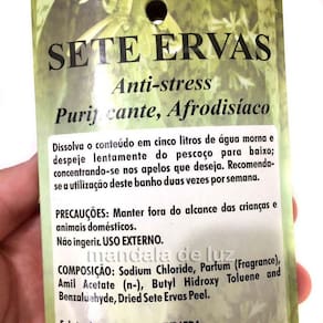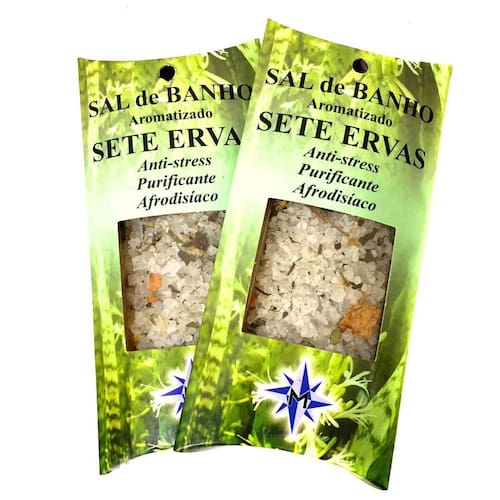 Sal de Banho - Sais - Banho -Sal Grosso - 7 Ervas Valor referente à 1 unidade Dissolva o conteúdo em 5 litros de água morna e despeje lentamente do pescoço para baixo, concentrando-se nos apelos que deseja. Peso: 100g Sal grosso e ervas