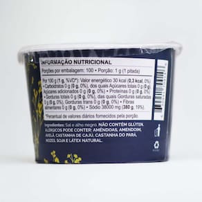 Sal de granulometria média e alho negro. NÃO CONTÉM GLÚTEN.