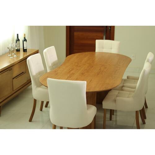 Sala de Jantar 6 Cadeiras Elegance Royal - Requinte Salas Deixe sua sala de jantar ainda mais elegante com a Mesa Alexandria e a Cadeira Royal. A Mesa Alexandria combina um design contemporâneo com uma base moderna e um tampo orgânico, tendência do momento. Para complementar, a Cadeira Royal oferece beleza, conforto e sofisticação. Seu assento curvo proporciona uma sensação de conforto, enquanto a base em madeira maciça garante resistência e estabilidade. Juntos, esses móveis criam um ambiente moderno e acolhedor, perfeito para momentos especiais. Faz Parte do Anúncio.: 1 Mesa de Jantar Tampo Orgânico Alexandria 6 Cadeiras com Braço Royal Particularidades da Mesa de Jantar: Características:- Estrutura em MDF laminado;- Base diferenciada;- Tampo orgânico;- Madeira ecologicamente correta;Dimensões da Mesa:Altura: 79 centímetrosLargura: - 2,40m de larguraProfundidade: - 1,10m de profundidade Particularidades da Cadeira Royal: Características:- Madeira Maciça Tauari seca em estufa- Madeira imunizada- Espuma D-26 no assento- Espuma D-20 no encosto- Tecido liso na parte de trás do encosto- Estrutura reforçada- Ecologicamente correta- Peso suportado 150kgDimensões da Cadeira Royal:Altura: 97 centímetrosLargura: 52 centímetrosProfundidade: 61 centímetros Informaçoes Importantes.: -Produtos podem apresentar diferenças de tonalidades entre a foto na tela e o produto real, devido a calibração de cor de tela.-Limpar com flanela ou pano macio. Não utilizar álcool. Não utilizar produtos abrasivos ou corrosivos.-Nós prezamos pela qualidade da entrega em primeiro lugar, trabalhamos com transportadoras altamente selecionadas e os melhores materiais de embalagem.-A montagem é de total responsabilidade do comprador. Antes de comprar, verifique o espaço disponível para a montagem.-Certifique-se de que o produto caiba em elevadores e vãos de escadas, não fazemos içamentos. Quaisquer despesas deste tipo ficam a cargo do cliente-Garantia de 3 meses contra defeitos de fabricação. Marca: Requinte Salas