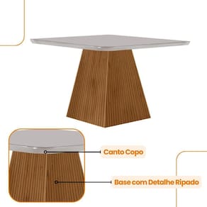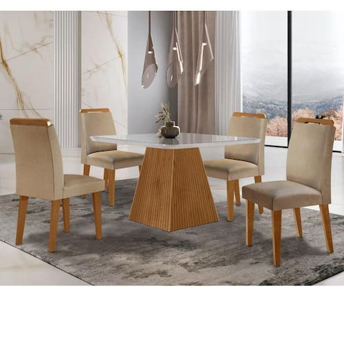 A Sala de Jantar Aida, combinada com as elegantes Cadeiras Athenas, e a escolha ideal para quem busca um espaco aconchegante e classico. O conjunto, produzido em MDF, destaca-se pela robustez e pelo detalhe Ripado da base, que trazem um toque de charme contemporaneo. O tampo canto copo em vidro nao so embeleza, mas tambem garante mais seguranca, especialmente em lares com criancas. As Cadeiras Athenas, com assento e encostos estofados, elevando o design e o conforto. Juntas, essas pecas criam um ambiente perfeito para momentos inesqueciveis a mesa.