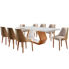 O conjunto de sala de jantar ane com cadeiras esmeralda é excelente para você que gosta reunir a família e os amigos ao redor da mesa para compartilhar boas refeições e criar boas memorias A Mesa de jantar Ane conta com um design exclusivo e é ideal para compor uma decoração que não dispensa elegância e versatilidade As cadeiras Esmeraldas possuem um design clássico e elegante, que proporciona muita comodidade ao seu ambiente. Seu assento e encosto em tecido linho e detalhe nas costas com tecido sintético -Courino-. Além da estrutura ser em Madeira Tauari, que oferece uma ótima durabilidade ao produto