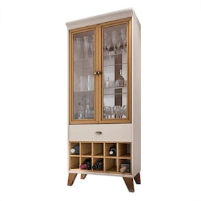 Cristaleira Intense • Produto em MDP e MDF de 25mm e 15mm • Pintura UV • 2 Prateleiras de vidro 6mm com suportes cromados • Espelho atrás da prateleira de vidro de 3 mm • 2 Portas de vidro emolduradas em MDF revestidas com papel melamínico • Puxador com acabamento metálico na cor bronze • Moldura superior robusta valorizando e realçando os aspectos retrô do móvel • Pés de madeira maciça levemente angulados com acabamento envernizado • Adega central para 10 garrafas