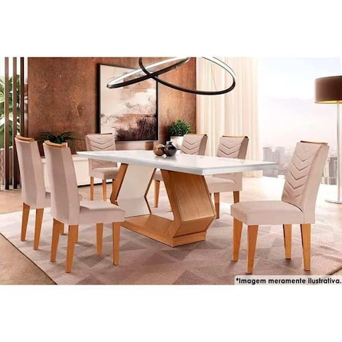 Abaixo segue os produtos do KIT: Sala de Jantar Completa Alvorada c/ Tampo Madeirado c/ Vidro 180x90cm e 6 Cadeiras Londrina Capuccino/Suede Creme - Rufato