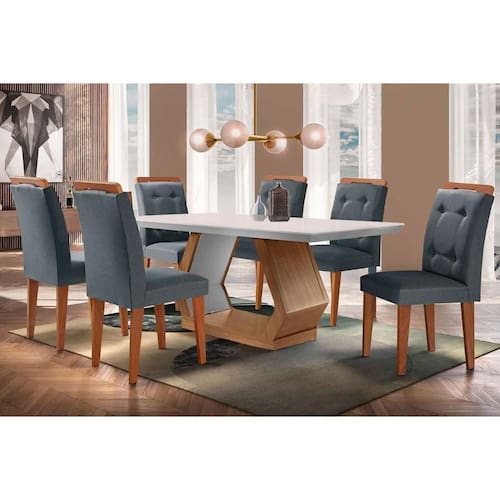 Sala de Jantar Completa Alvorada c/ Tampo Madeirado Canto Reto 180x90cm e 6 Cadeiras Imperatriz Imbuia/Off White - Suede Grafite - Rufato