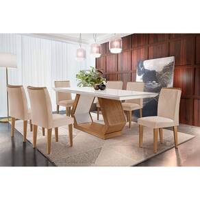 Abaixo segue os produtos do KIT: Sala de Jantar Completa Alvorada Tampo Madeirado c/ Vidro Canto Reto 180x90cm e 6 Cadeiras Amsterdã Imbuia/Off White - Suede Creme - Rufato