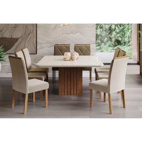 Sala de Jantar Completa Ana c/ Tampo Madeirado c/ Vidro 130x130cm e 8 Cadeiras Fernanda Savana-Nature/Off White-Suede Joli Capuccino - Cimol Abaixo segue os produtos do KIT: Sala de Jantar Completa Ana c/ Tampo Madeirado c/ Vidro 130x130cm e 8 Cadeiras Fernanda Savana-Nature/Off White-Suede Joli Capuccino - Cimol