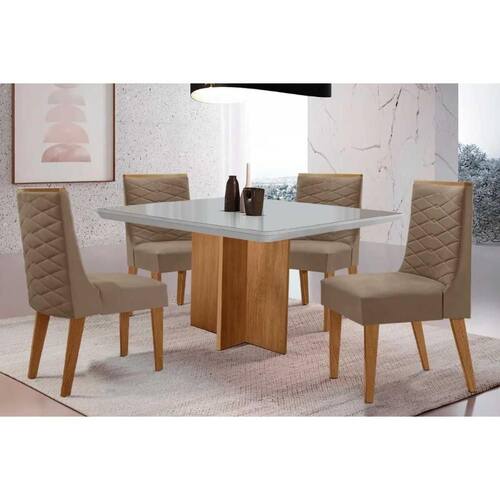 Sala de Jantar Completa Berlim c/ Tampo Madeirado c/ Vidro Canto Curvo 90x90cm e 4 Cadeiras Dafne Naturale/Off White - Suede Capuccino - Rufato Abaixo segue os produtos do KIT: Sala de Jantar Completa Berlim c/ Tampo Madeirado c/ Vidro Canto Curvo 90x90cm e 4 Cadeiras Dafne Naturale/Off White - Suede Capuccino - Rufato