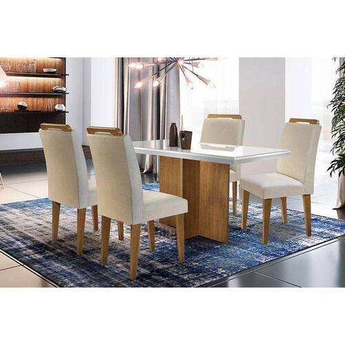 Sala de Jantar Completa Berlim c/ Tampo Madeirado c/ Vidro Canto Reto 120cm + 4 Cadeiras Athenas Imbuia/Veludo Creme - Rufato