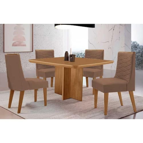 Sala de Jantar Completa Berlim c/ Tampo Madeirado Canto Curvo 90x90cm e 4 Cadeiras Maldivas Naturale - Corano Capuccino - Rufato - Sala de Jantar Completa Rufato