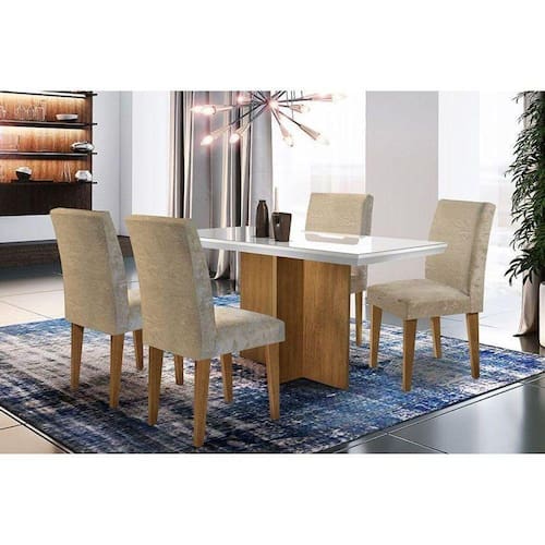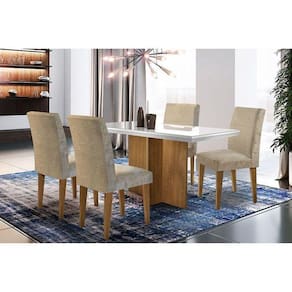 Sala de Jantar Completa Berlim c/ Tampo Madeirado c/ Vidro Canto Reto 120cm + 4 Cadeiras Grécia Imbuia/Capuccino Chocolate - Rufato
