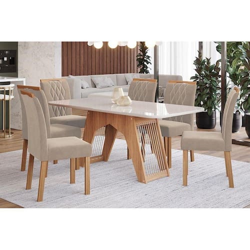 Conjunto: Mesa Sala Jantar Carol c/ Tampo Madeirado c/ Vidro 180cm + 6 Cadeiras Juliana Nature/Off White/Madeira/Linho Bege - Cimol Abaixo segue os produtos do KIT: Conjunto: Mesa Sala Jantar Carol c/ Tampo Madeirado c/ Vidro 180cm + 6 Cadeiras Juliana Nature/Off White/Madeira/Linho Bege - Cimol